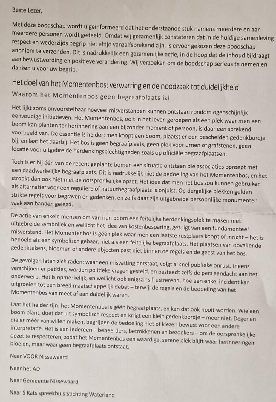Als reactie op de petitie “Ruimte voor herinneringen in Momentenbos”, mocht ik persoonlijk (net als nog wat geadresseerden) een anonieme brief per post ontvangen. Zie foto’s.