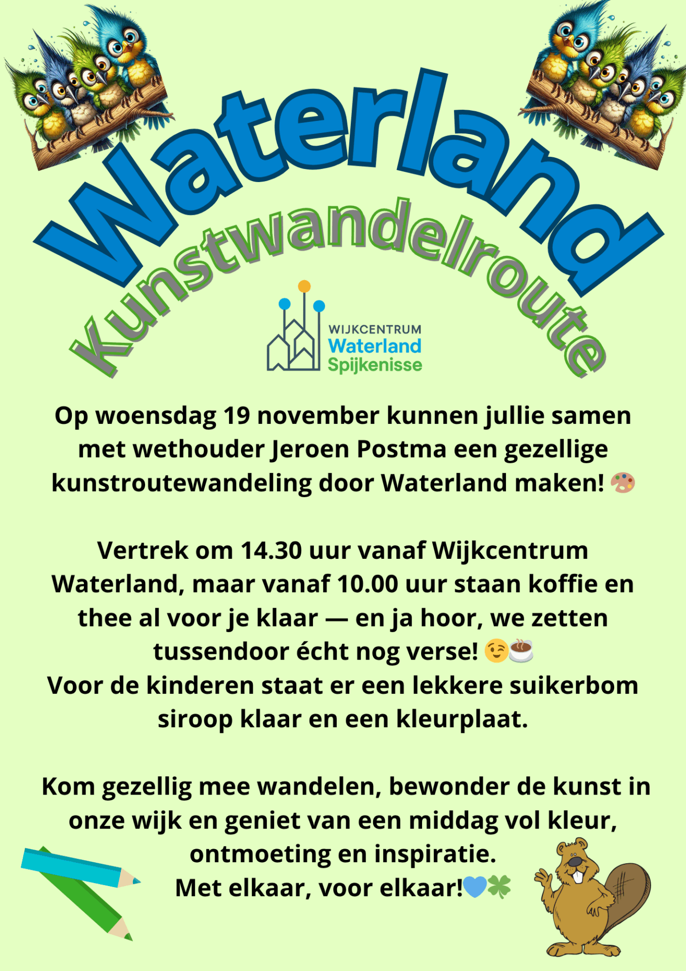 Ontdek de kunst in Waterland tijdens de kunstroutewandeling op 19 november met wethouder Postma. Start om 14.30 uur vanaf Wijkcentrum Waterland. Koffie, thee en siroop vanaf 10.00 uur!