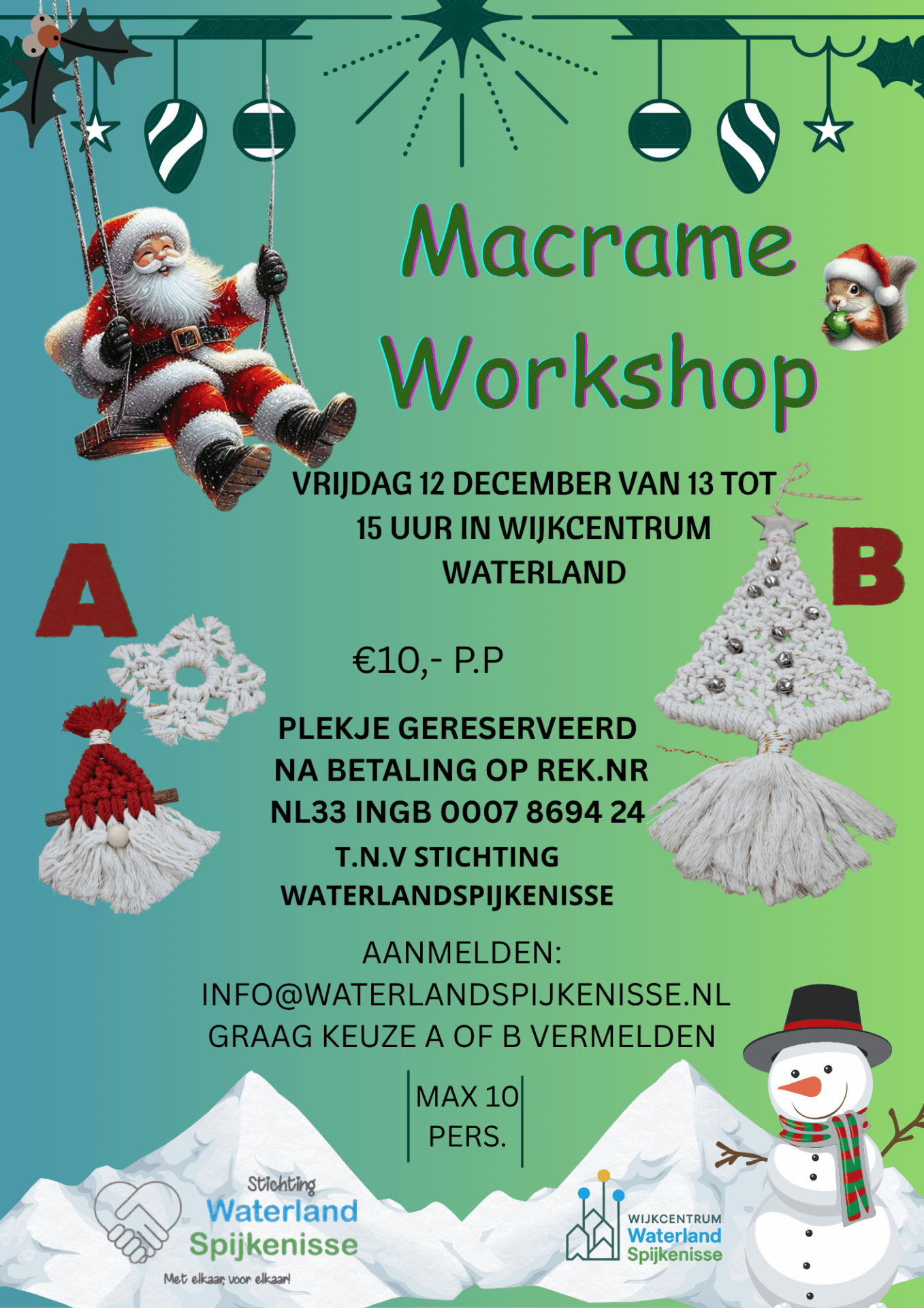 Op vrijdagmiddag 12 december is er van 13 tot 15 uur een leuke macramé workshop in wijkcentrum Waterland. Kosten zijn € 10 per persoon en er is keuze tussen A (kerstmannetje en ijskristal) of B (Kerstboompje 35 cm hxb 15 cm) Graag bij aanmelding keuze doorgeven.
