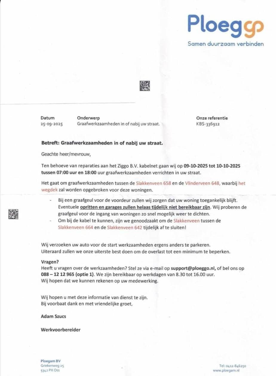 In verband met werkzaamheden zal een deel van Slakkenveen/Vlinderveen worden afgezet op 9-10 tot 10-10 tussen 07.00 en 18.00 uur
